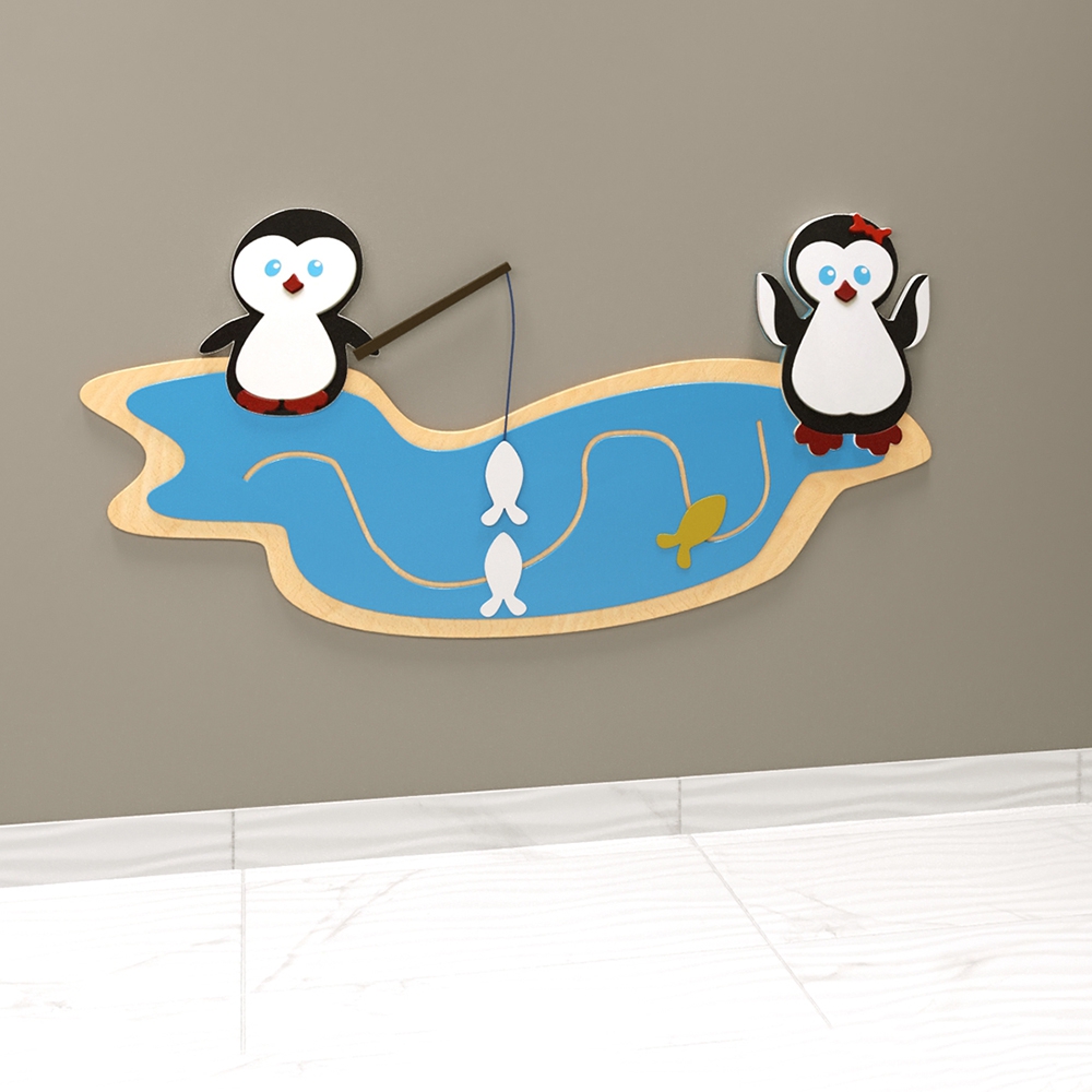 Бизиборд – дидактическое приспособление с игровым уклоном для детей от 1 года. Может быть как объёмным (куб, домик), так и более компактным - в виде плоской настенной панели, которая замечательно экономит игровое пространство, не уменьшая при этом его ценности. Бизиборд в виде пингвинов с удочками - одна из таких моделей, которая крепится к стене. Украшена фигурками пингвинчиков (мальчика и девочки) и рыбок.