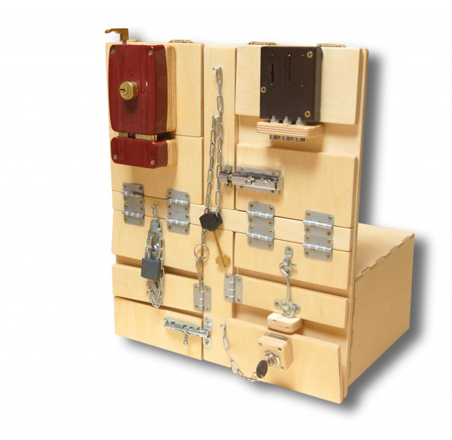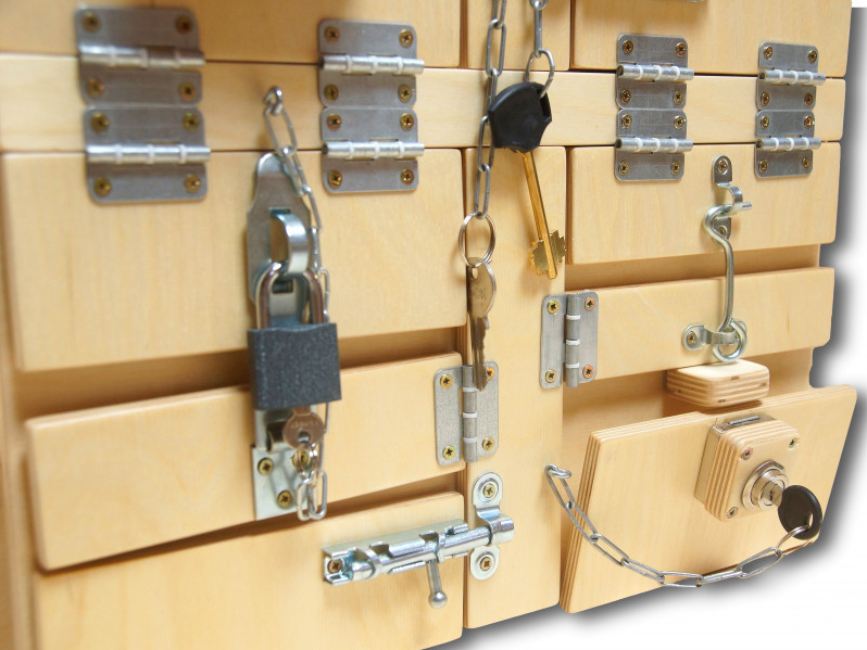 • Разнообразные задвижки, замочки, замки и защелки развивают мелкую моторику, логику и координацию движений у ребенка.