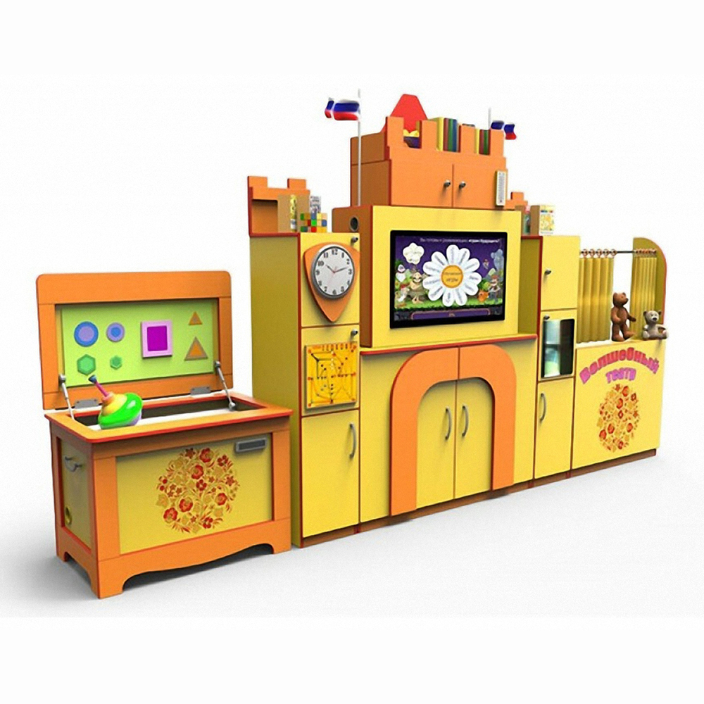 Огромный комплекс выполнен из ЛДСП, сертифицированного и допущенного для изготовления детских товаров. В комплектацию входит сенсорный экран диагональю 32" дюйма и разрешением 1920х1080 px, современный персональный компьютер Intel Core i3 с видеокартой Intel HD Graphics, клавиатура, мышь, кабели HDMI и Usb, сетевой фильтр на 4 розетки, акустическая система и зеркало.