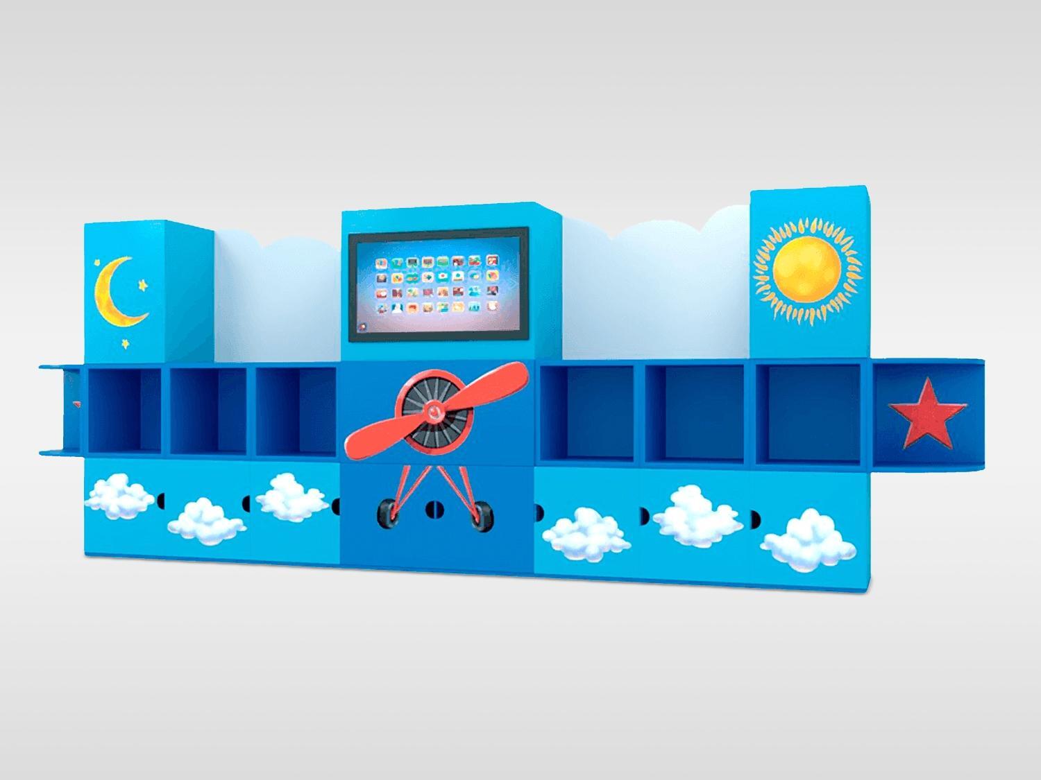 Продуманный до мелочей дизайн компактно вмещает в себя несколько игровых зон. На центральной части находится интерактивная панель со специализированным программным обеспечением. Удобные открытые книжные полки, скрытая от детского взгляда система хранения, соответствуют всем требованиям ФГОС.
