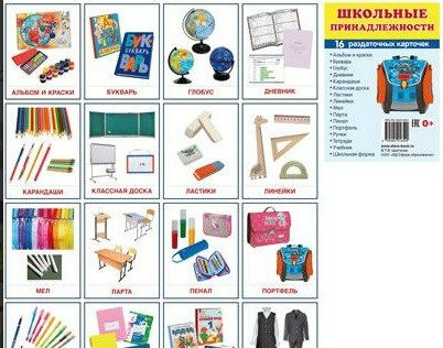 Набор из 16 раздаточных карточек, посвященных школьным принадлежностям. На каждой предметной картинке с одной стороны - цветная иллюстрация, с другой - название картинки на русском и английском языках. Издание способствует познавательному и речевому развитию детей. Рекомендуется использовать в комплекте с плакатом и демонстрационными картинками. Такие карточки можно использовать на любых занятиях, в играх, для самостоятельной деятельности детей.