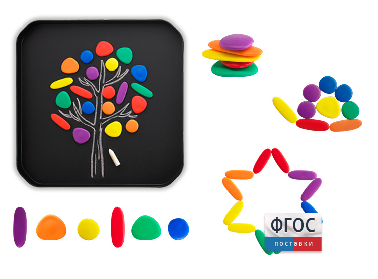 В наборе 36 камешков 3 форм в 6 ярких цветах и 8 двухсторонних карточек с заданиями.