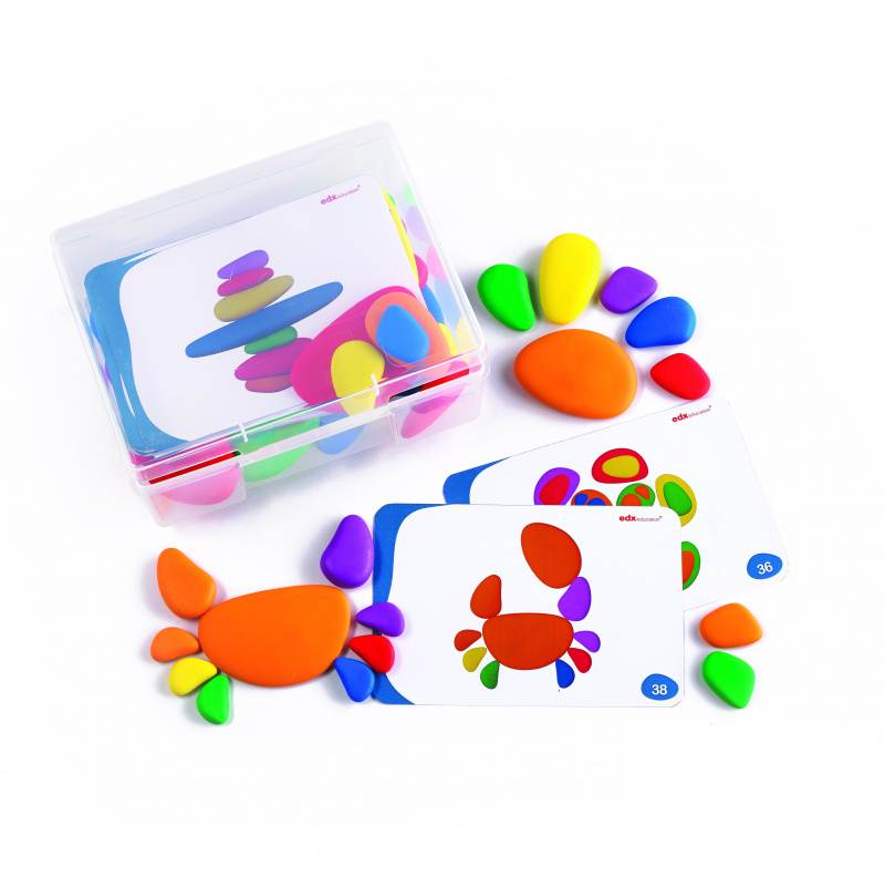 Набор состоит из 36 цветных камешков и 20-ти двухсторонних карточек, в которых приведены примеры заданий.