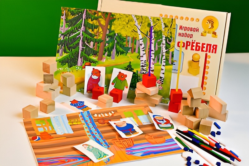 Набор разработан в соответствии с педагогическими принципами Фребель-педагогики и представляет собой специально составленные комплекты из элементов «Даров Фребеля» с авторскими иллюстрациями по мотивам сказок русских писателей. Карточки изготовлены из мелованной бумаги, ламинированной пленкой. Печать полноцветная. Элементы для игры изготовлены из дерева и пластика и упакованы в зип-пакеты.