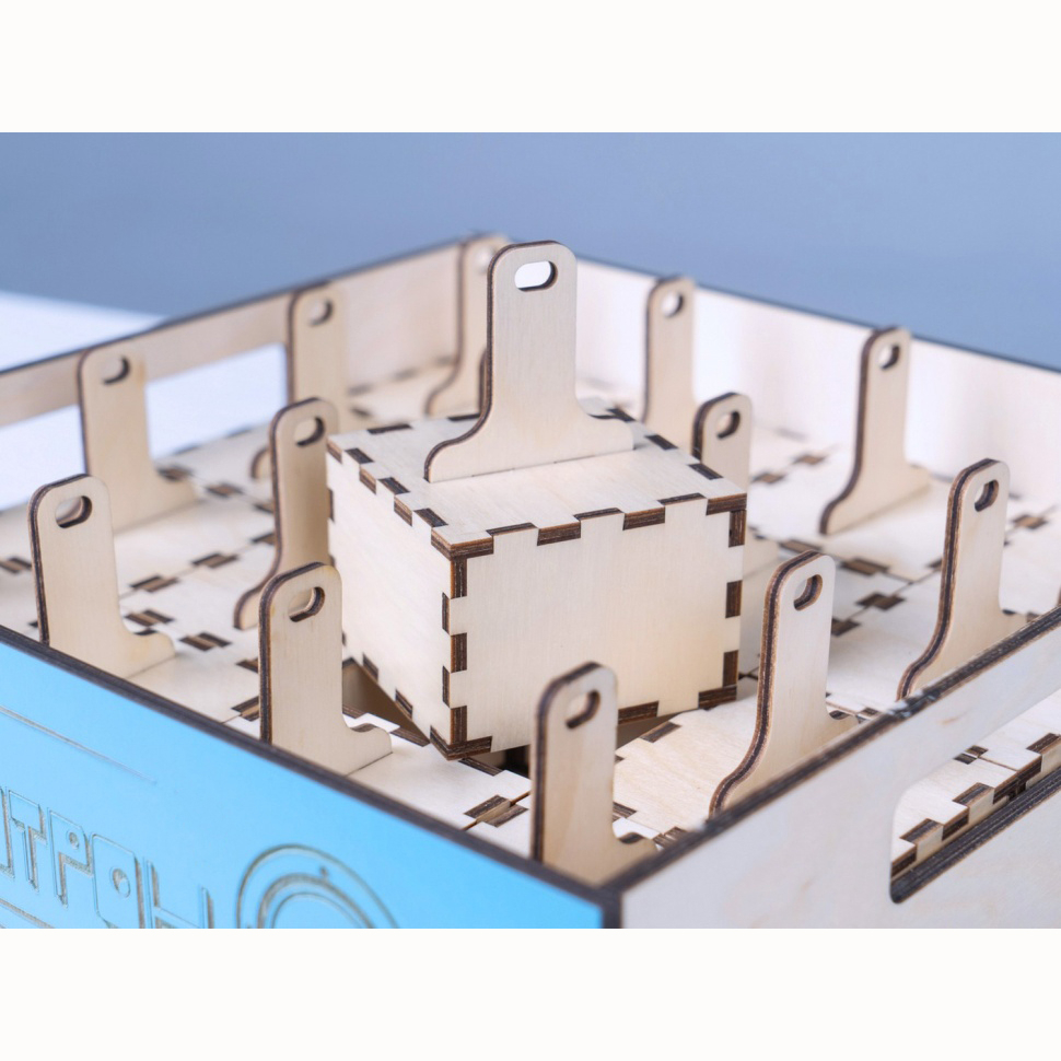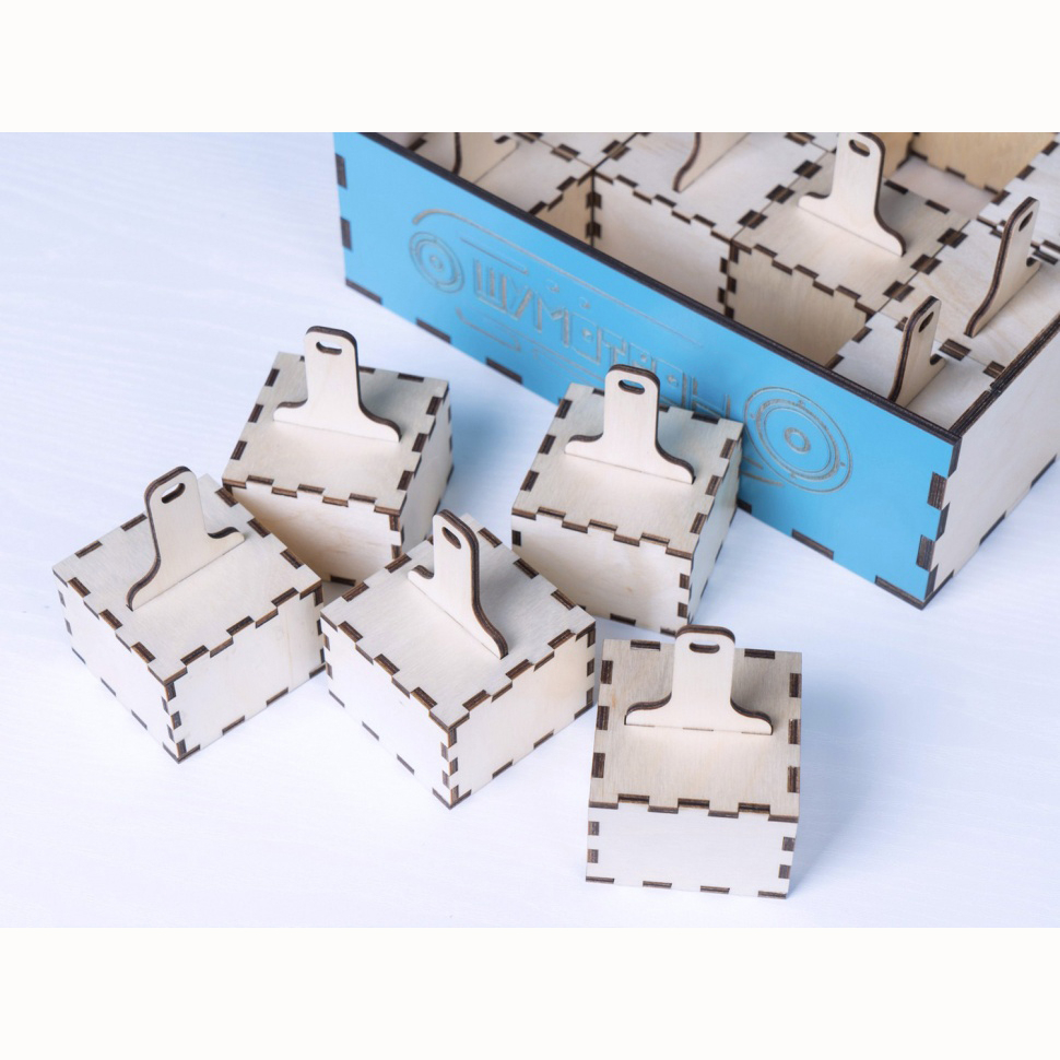 Шумовой набор состоит из ящика и 16 деревянных парных коробочек с 8 видами наполнения. Каждая коробочка имеет удобную ручку с парными метками, которые помогают контролировать точность выполненного задания.