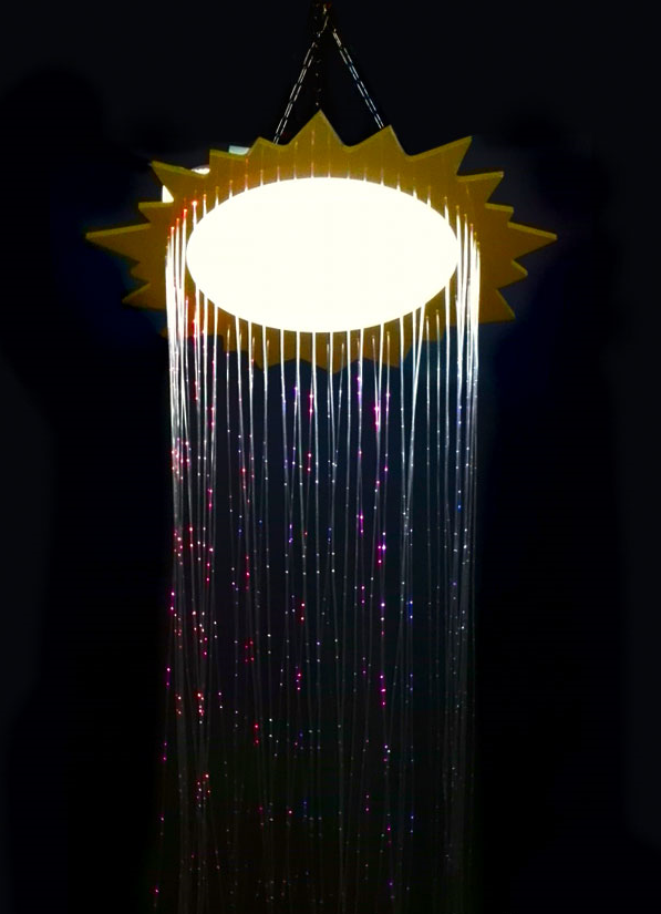 Фибероптический душ «Солнышко» имеет оригинальный дизайн. Подвесная платформа выполнена в виде светящегося Солнышка с ярко-желтыми лучиками. В продолжение лучиков выведены светящиеся нити, которые свисают вниз и искрятся разными цветами. Подвес к потолку.