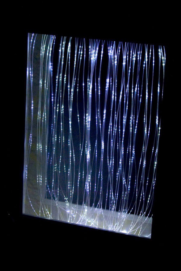 Безопасное небьющееся зеркало с подсветкой светящимися фибероптическими нитями бокового свечения. Эффект мерцания свисающих нитей различными цветами на фоне зеркала. Светодиодный источник света в комплекте.