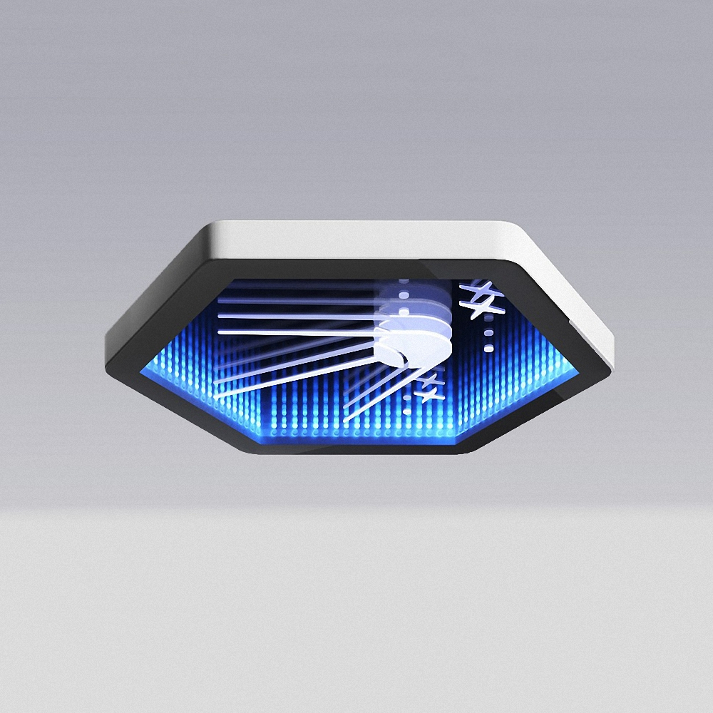 Для оформления потолка в сенсорных комнатах отлично подойдут потолочные панели. Шестигранные светильники мерцают в темноте словно иллюминатор, ведущий в глубины загадочного космоса. Это завораживает внимание малышей, нормализует работу нервной системы и успокаивает пульс, помогает расслабиться и отключится от тревожных мыслей. Потолочные панели имеют зеркальную поверхность и расположенную внутри светодиодную подсветку.