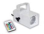 Источник света для зеркальных шаров с белыми зеркалами. Цветовая палитра – 15 фиксированных цветов (переключаются с пульта), при плавном переборе – неограниченное количество цветов. Управляется источник света инфракрасным пультом, на котором расположены кнопки фиксированных цветов и режимов управления световым прибором.