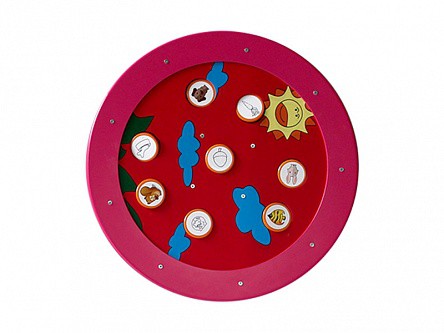 Игровой модуль представляет собой планшет в форме круга с расположенными на нём изображениями, образующими смысловые пары (собака - кость, заяц - морковка, белка - орешек, аквариум - рыбка). При нажатии на один из элементов пары появляется второй элемент. При вращении колеса игра сбрасывается и можно продолжать искать другие пары. Игровой сенсомоторный модуль предназначен для развития моторных навыков рук, познавательной активности и зрительно-моторной координации. Модуль используется в качестве самостоятельной единицы или в составе тактильно-интерактивного комплекса учебно-игровых средств для игровых комнат, методических кабинетов, кабинетов ЛФК и сенсорных комнат в общеобразовательных и специализированных коррекционных учреждениях.