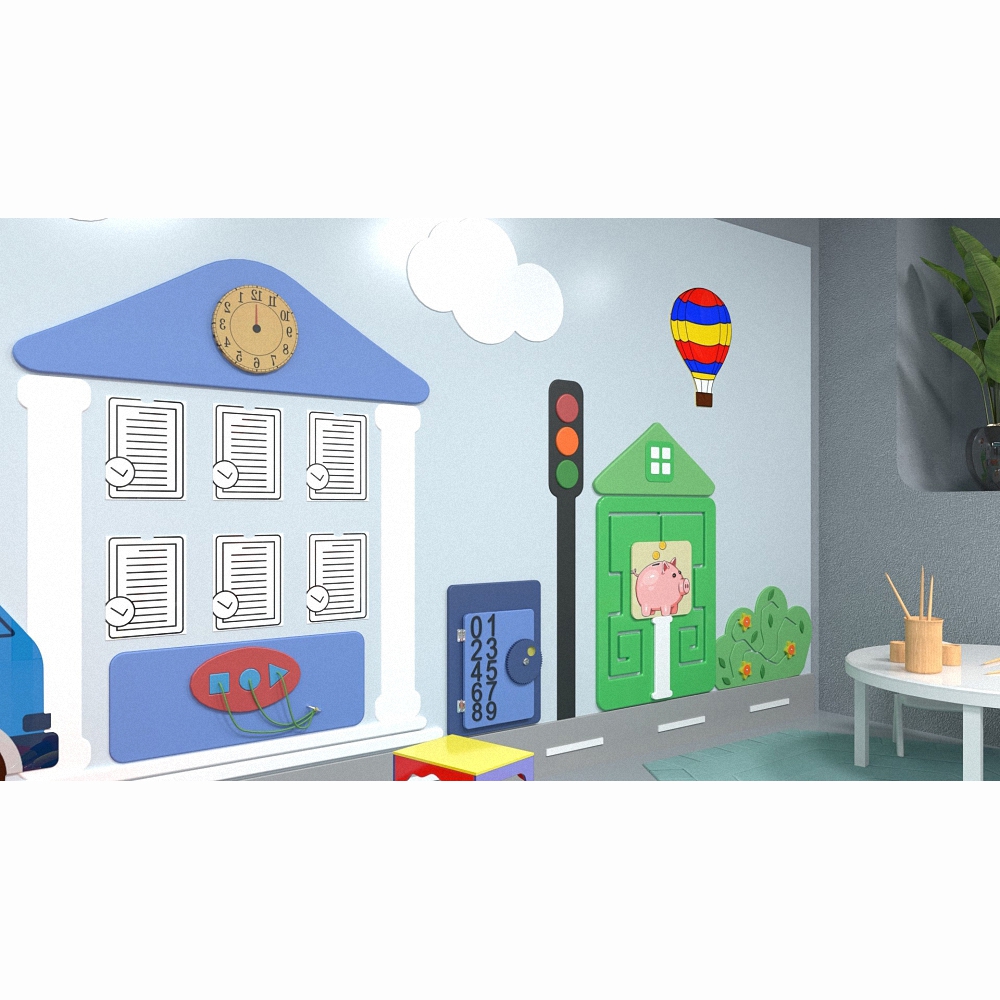 Для чего нужно: настенная панель «Банк» не нуждается в дополнениях и может выступать как самостоятельное оснащение игровой зоны в общественном учреждении (медицинской клинике, банке, кафе, ресторане) благодаря размерам и обилию разнообразных функций.