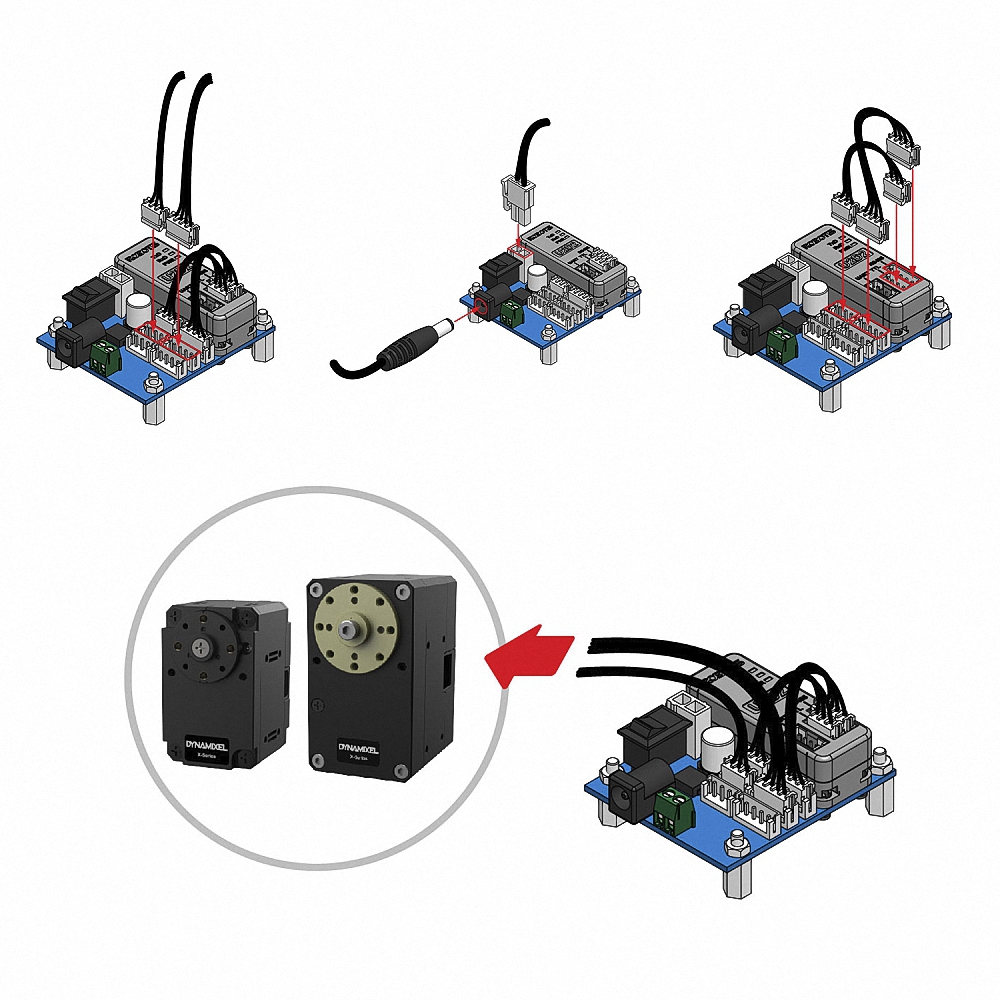 Преобразователь интерфейса U2D2 Power Hub Board имеет только разъем типа JST и для подключения к разъемам типа Molex требует наличия Convertible-кабеля. Необходимые кабели: минимум, 2 шт (U2D2 <-> DYNAMIXEL, U2D2 PHB <-> DYNAMIXEL).
