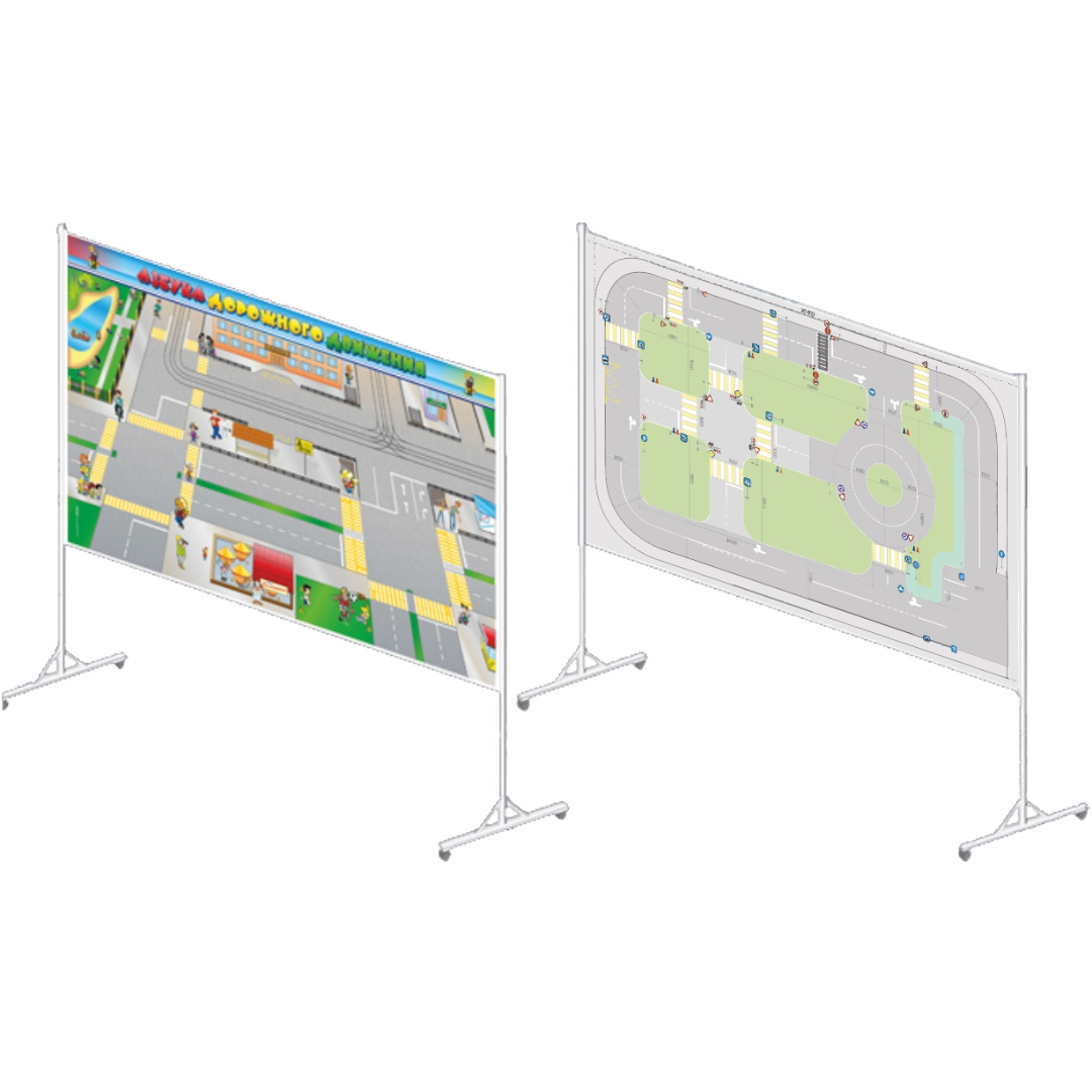 Стенд представляет собой двустороннюю напольную магнитную доску с наклеенными схемами дорожного движения. С помощью стенда ребенок учится правилам поведения на дорогах и на территории пешеходной зоны. С одной стороны на стенде представлена схема "Азбука дорожного движения", с другой стороны схема – четырехсторонний перекресток и круговое движение.