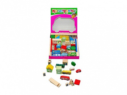 Конструктор представляет собой набор деревянных деталей в виде различных элементов ландшафта, объектов архитектуры города и транспортных средств.