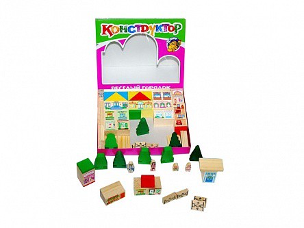 Конструктор представляет собой набор деревянных деталей в виде различных элементов ландшафта и объектов архитектуры города.