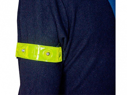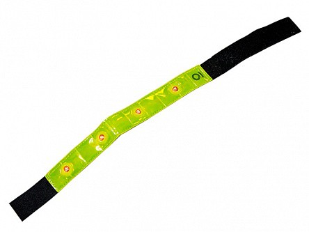 Световозвращающий светодиодный браслет на текстильной застежке представляет собой изделие из ткани со световозвращающим покрытием желтого цвета и четырьмя красными светодиодами с тремя режимами работы.