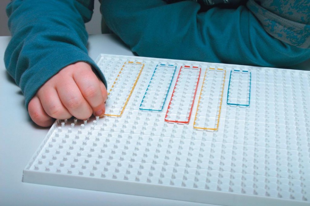 Игровое поле геоборда – пластиковый планшет с выступающими колышками, расположенными с одинаковыми промежутками по горизонтали и вертикали, за которые можно цеплять входящие в набор резинки и «рисовать» геометрические фигуры. Сетка колышков с промежутками в 1 см.