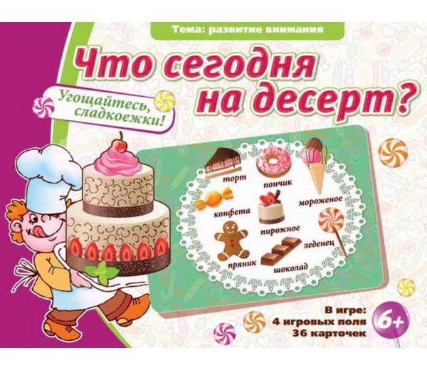 На маленьких карточках, которых в игре ровно 36, изображены различные десерты. Тут нужен глаз да глаз! Вот только что было приготовлено восемь разных десертов, а через секунду – осталось семь! Мы не спрашиваем, кто пробегал мимо, нас интересует другое. Что исчезло? Перед чем не устояли сладкоежки?