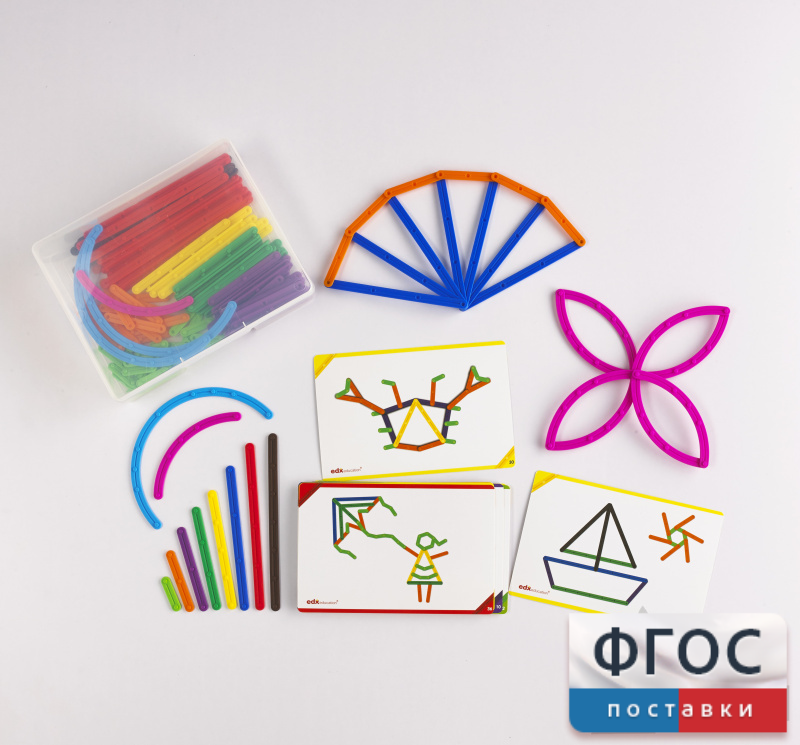 В комплект входит: 200 гибких пластиковых палочки, 30 двусторонних карточек с заданиями и инструкция.