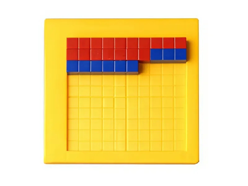 Счетный квадрат изготовлен из пластмассы, представляет собой пластину 13*13 см с четырьмя бортиками, служащими упорами при выкладывании счетного материала и предохраняющими его от рассыпания. Рабочее поле размером 10*10 см разлиновано на клетки 1*1 см. Вертикальная и горизонтальная линии, обозначающие пятый сантиметр, шире и глубже, что облегчает ориентирование при выполнении заданий.