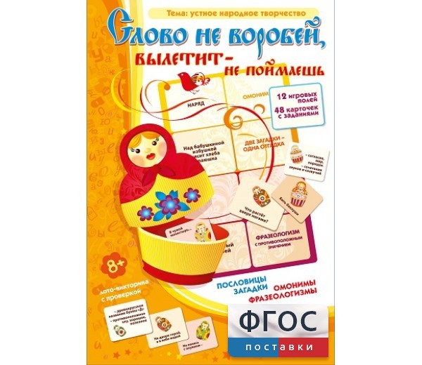 В игре - дюжина больших карточек и четыре дюжины – маленьких. Перед игроками стоят непростые задачи: подобрать продолжение пословицы, объяснив её смысл; разгадать сразу две загадки с одинаковым ответом-разгадкой, найти слова-омонимы. Задание с подбором фразеологизмов с противоположными значениями заставит задуматься даже опытных игроков! А в награду за правильные ответы на карточке собирается семейство весёлых матрёшек в одинаковых нарядах. Они-то и служат проверкой.