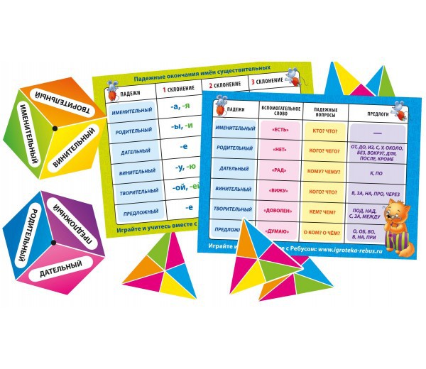 В игре: 42 карточки со словарными словами, три карточки-проверки, два волчка с заданиями, таблица «Падежи и падежные окончания имён существительных»