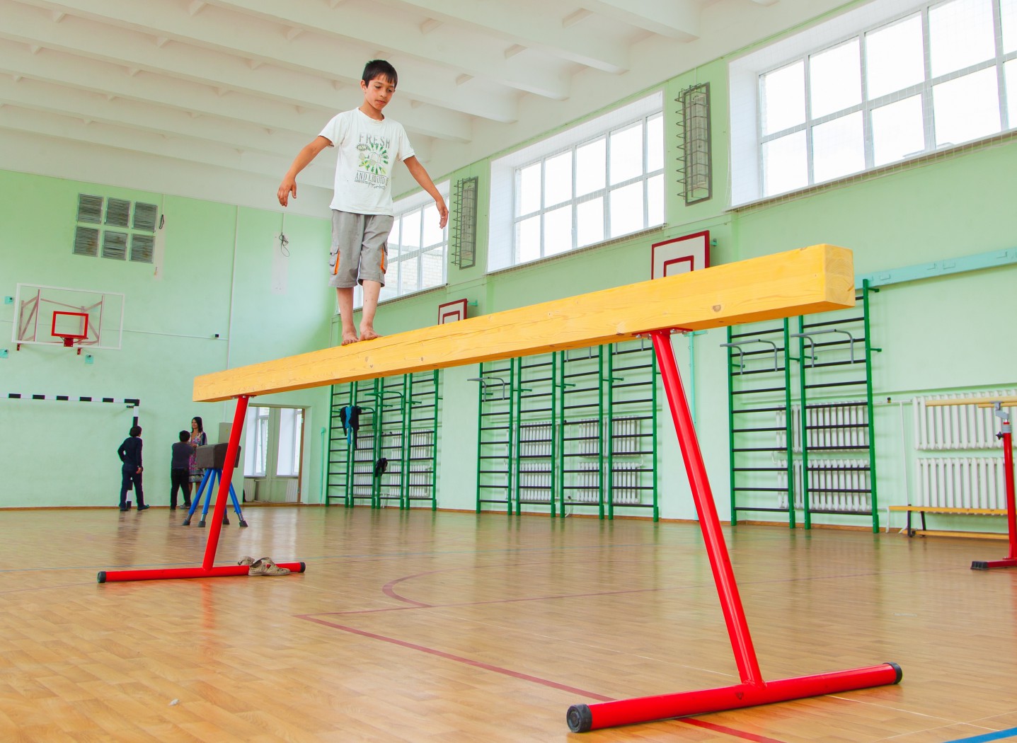 Бревно гимнастическое представляет собой сборную конструкцию, состоящую из корпуса и 2-х неподвижных деревянных опор. Корпус выполнен из клеёного бруса хвойных пород древисины, опоры выполнены из трубы диаметр 57мм.