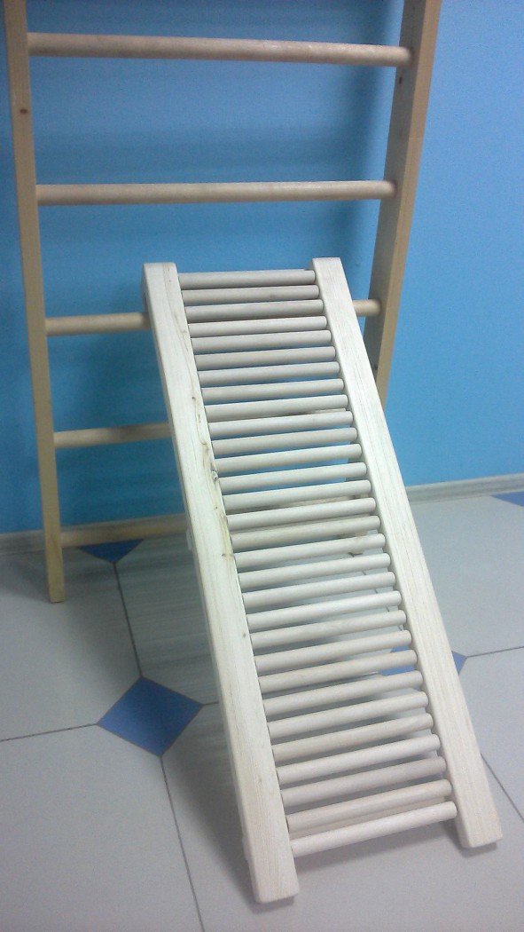 Навешивается на шведскую стенку, может использоваться самостоятельно - доску можно класть на пол без дополнительных креплений.