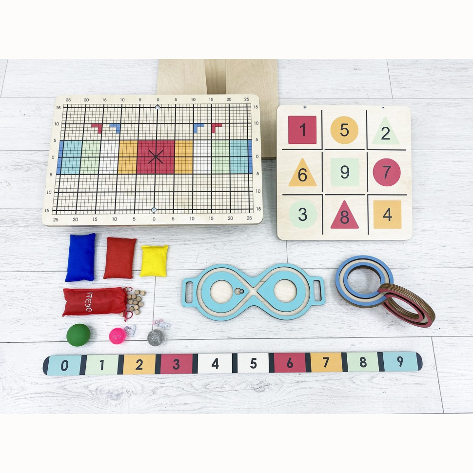 Комплект состоит из оригинальной доски Бильгоу с дополнительным инвентарём и тренажёров для развития мозга – нейровосьмёрки и 3D-восьмёрки. Он подходит для оборудования кабинета детского психолога, логопеда, физиотерапевта.