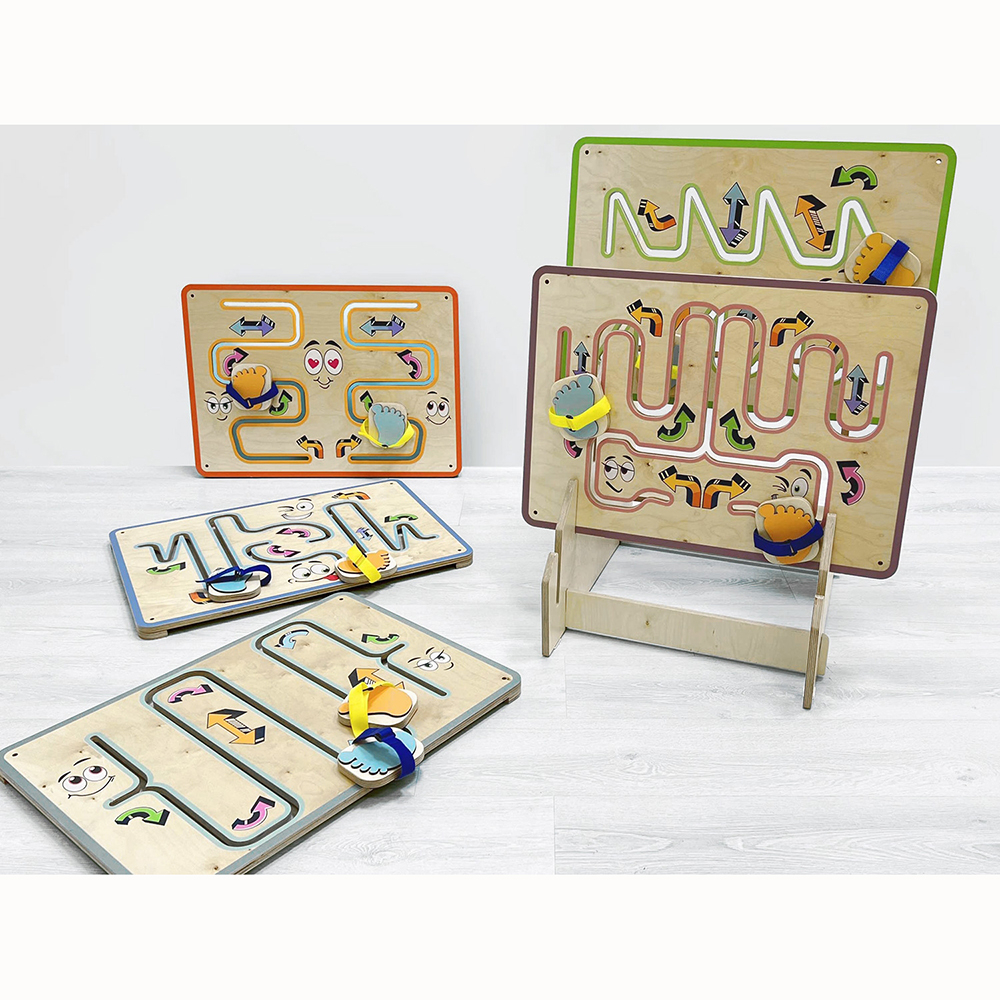 В комплекте идёт пять платформ-лабиринтов и подставка для них. Можно повесить все сразу, если позволяет помещение, можно только одну — и заменять платформы по мере надобности. В методическом пособии собраны варианты занятий, которые можно проводить с детьми.