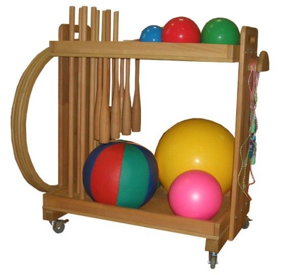 Тележка из натурального дерева на колесах с тормозами. Предназначена для хранения гимнастических снарядов для занятий лечебной физкультурой в условиях специализированных реабилитационных и гимнастических залов.