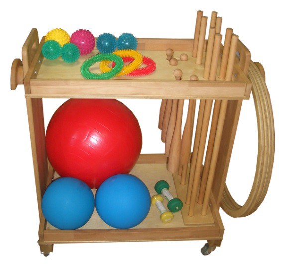 Наполнение тележки включает в себя: 8 гимнастических палок из натурального дерева, 6 булав из натурального дерева, 4 обруча из натурального дерева,  комплект мячей (в т.ч. мяч гимнастический, мячи утяжеленные типа «медицин бол», мячи массажные типа «ежик»), кольцо типа «ёжик», скакалки, гантели.