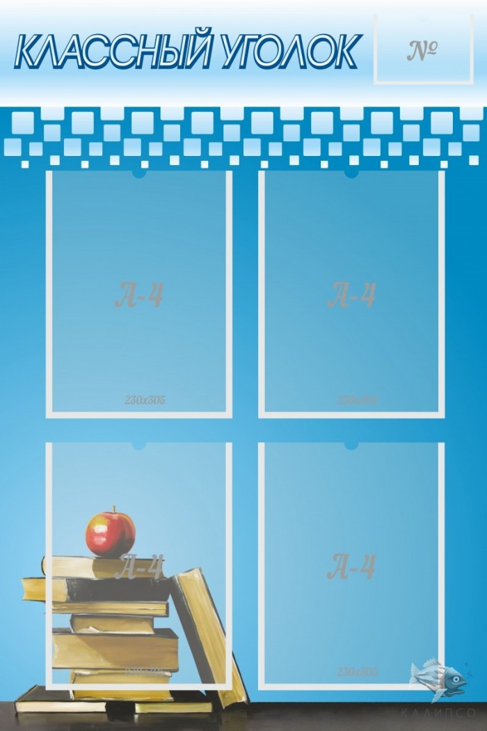 В каждом учебном классе имеется свой классный уголок. На нем систематизирована основная информация об учениках, расписании уроков, правилах поведения в классе и графиках дежурства. Данный стенд может использоваться в старших классах, а также в учреждениях, где обучают не только детей, но и взрослых. Так как он выполнен в строгом стиле без дополнительных цветных иллюстраций. У него основной синий фон и он состоит из четырех кармашков. В каждый из кармашков может быть помещена любая информация. Стенд выполнен в вертикальном положении, что позволяет его удобно разместить на узком участке стены.