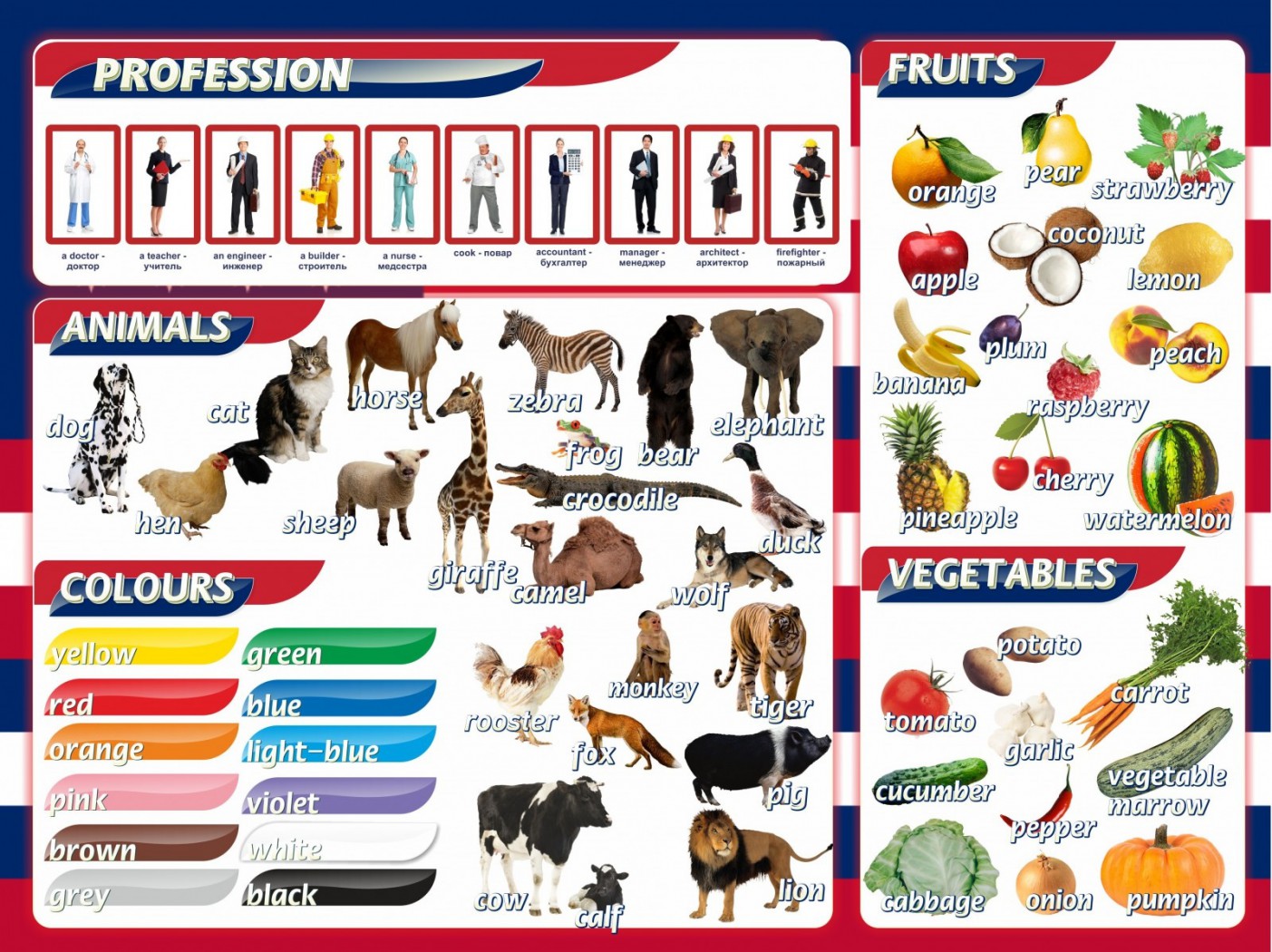 Огромный пластиковый стенд для детей среднего и младшего школьного звена расскажет на английском языке о самых популярных профессиях, часто встречающихся животных, базовой цветовой палитре и фруктах/ овощах, без которых немыслима ни одна современная кухня мира.
