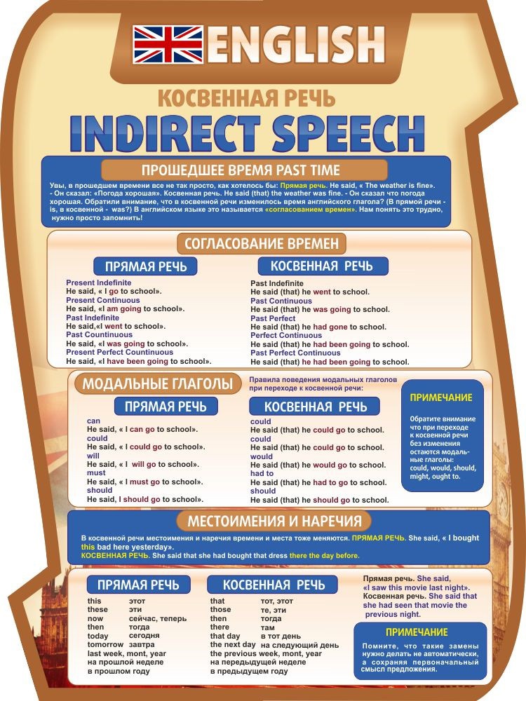 Употребление косвенной речи, согласование времен и модальные глаголы, такие сложные местоимения и наречия, нужные примечания – всё это в максимально удобной форме расположено  на резном стенде.