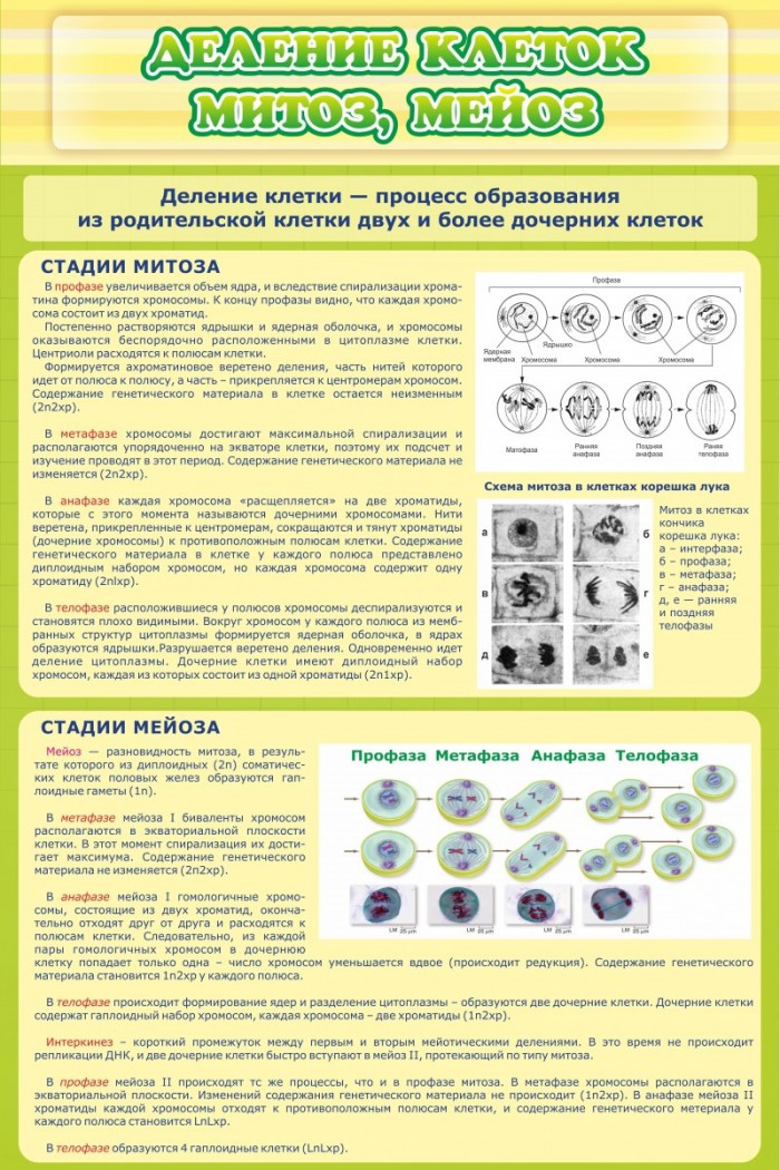 У многих учеников возникают проблемы с делением клетки. Они просто напросто путают митоз с мейозом. На этом стенде они смогут найти всю интересующую информацию по поводу деления клеток. Этот стенд удобен тем, что на нем есть определение, что такое деление клеток, присутствует описание каждой стадии митоза и мейоза, есть на нем и схемы с подписями, которые все объясняют графически. Яркая надпись "деление клеток митоз, мейоз" привлечет к себе внимание ученика. На стенде приятный фон, который будет радовать глаз и педагога, и ученика. Стенд сделан из высокопрочных материалов, что сохранит его в первоначальном виде на долгие годы.