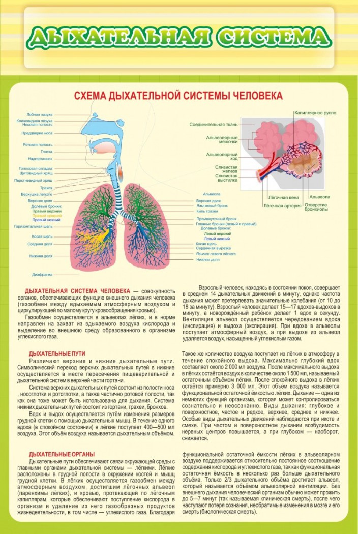 Настенный стенд «ДЫХАТЕЛЬНАЯ СИСТЕМА» в простой и четкой форме расскажет ученикам о строении носоглотки, бронхов, легких и альвеол. Понятные рисунки, развернутые определения понятий: дыхательная система человека, дыхательные пути и дыхательные органы.