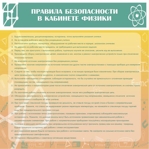 Главная Каталог Стенды Кабинеты Физика Стенд "Правила безопасности в кабинете физики"