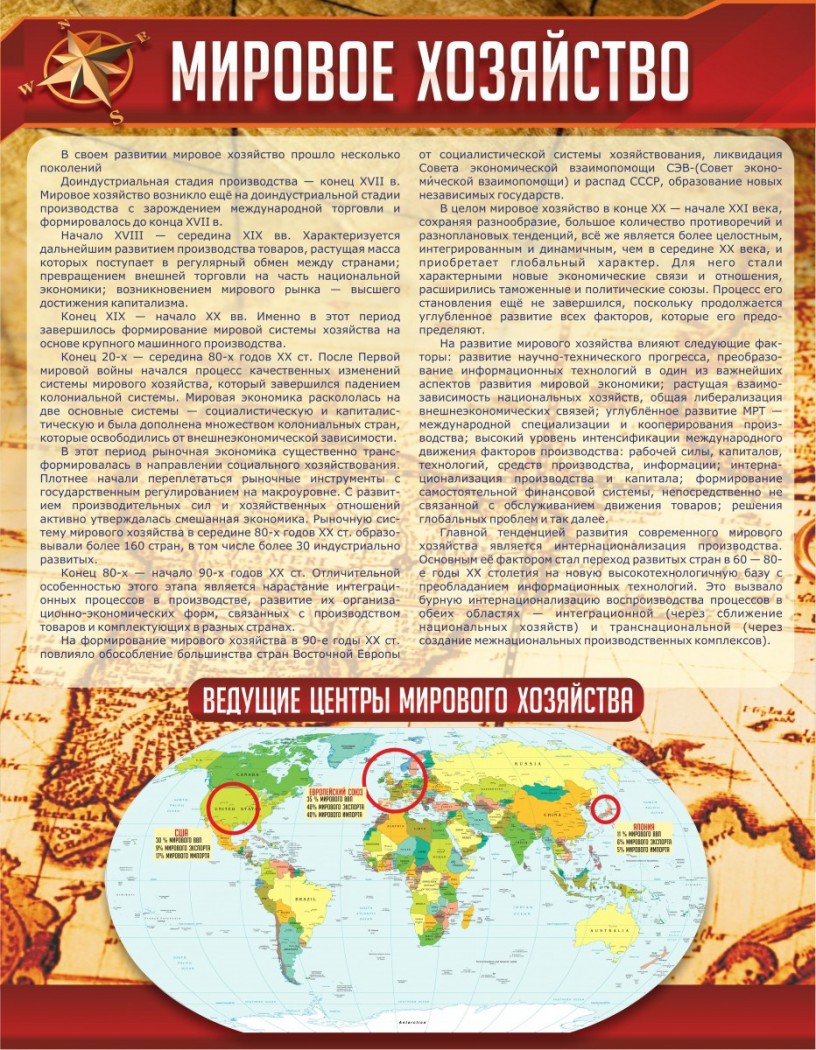 Любопытным ученикам придется по вкусу этот стенд. На нем понятно изложена вся информация о мировом хозяйстве. Ученик сможет ответить на такие вопросы: что это также, когда оно зародилось, когда произошел расцвет мирового хозяйства, благодаря чему произошел он, структура мирового хозяйстве. Также на стенде присутствует карта, где выделены крупные центры мирового хозяйства. Приведены числовые значения. Стенд обладает простотой и скромностью, но притом за счет своего фона он благороден, что помогает ему вписаться в интерьер любого класса. Качество стенда на высоком уровне, а это значит, что он прослужит долгие годы.