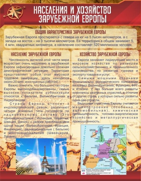 Любопытным ученикам придется по вкусу этот стенд. На нем доступно изложена информация о Зарубежной Европе: общая характеристика, селение и хозяйство Зарубежной Европы. Также на стенде присутствует карта Зарубежной Европы. Стенд обладает простотой и скромностью, но притом за счет своего фона он благороден, что помогает ему вписаться в интерьер любого класса. Качество стенда на высоком уровне, а это значит, что он прослужит долгие годы. Любопытным ученикам придется по вкусу этот стенд. На нем доступно изложена информация о Зарубежной Европе: общая характеристика, селение и хозяйство Зарубежной Европы. Также на стенде присутствует карта Зарубежной Европы. Добавляет ему некий шарм и фотография Эйфелевой башни. Стенд обладает простотой и скромностью, но притом за счет своего фона он благороден, что помогает ему вписаться в интерьер любого класса. ПВХ- пластик, пленка с фотопечатью, и ламинирующая пленка сделают стенд долгосрочным, сохранив его первоначальное состояние на долгое время. Краска не поблекнет и не потускнеет.