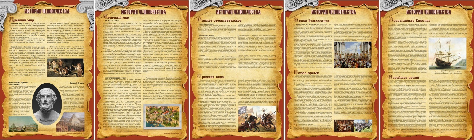 Фантастически привлекательный на вид стенд на тему истории человечества. Здесь не только сжатая и важная информация, вплоть до новейшего времени, но и яркие картинки. Как известно, в школьном возрасте, дети чаще обращают внимание на стенды с изображениями. С психологической точки зрения, им и информацию больше захочется читать. Даже старшеклассники, все еще дети, и подача важнейших сведений, вместе с красочными изображениями, вызовет восторг. Тогда и прочитать исторические секреты, захочется каждому ученику. Приятный дизайн стенда и лаконичная информация, понравится не только школьникам, но и их учителям. Карманов на стенде не имеется.