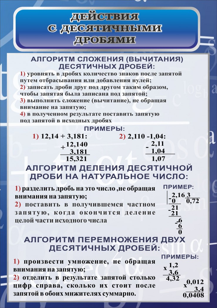 Главная Каталог Стенды Кабинеты Математика Стенд "Действия с десятичными дробями"