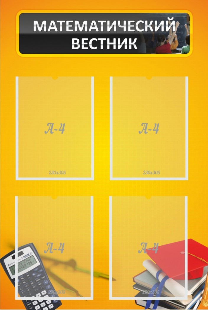 Яркий и симпатичный стенд оранжево-желтого оттенка, покорит любого ученика и преподавателя. Этот стенд включает четыре кармана А4, которые учителя могут заполнять вместе со школьниками… Ведь недаром, стенд носит название «Математический вестник»! Так же можно помещать туда различные интересные задания, вроде тех, что бывают на математических олимпиадах для школьников. В общем, существует возможность творчества и креатива. Ведь такие дисциплины, как геометрия и алгебра, тоже должны быть освещены новостями из математической сферы, поданными в уникальной «обертке»! Учеников следует вовлекать в интересные занятия и процессы, но ни все преподаватели это осознают, к глубочайшему сожалению.