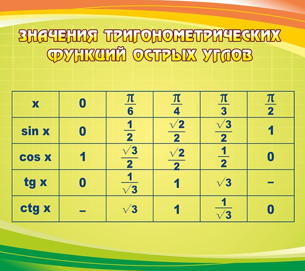 Стенд "Значения тригонометрических функций острых углов"