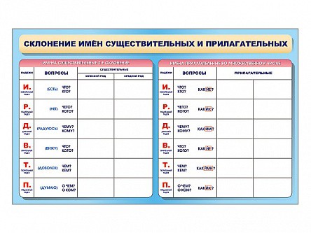 Главная Каталог Стенды Кабинеты Начальная школа Фрагмент (демонстрационный) маркерный (двухсторонний) "Склонение имен существительных и прилагательных"