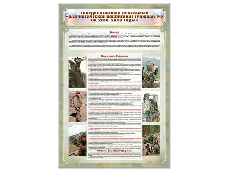 Стенд представляет собой информационную панель, на которой размещена государственная программа "Патриотическое воспитание граждан РФ на 2011-2015 гг.". Стенд предназначен для наглядного отображения целей, задач и механизма государственной программы, нацеленной на патриотическое воспитание граждан РФ, а также для формирования у учащихся или курсантов патриотического сознания как основы активной жизненной позиции.
