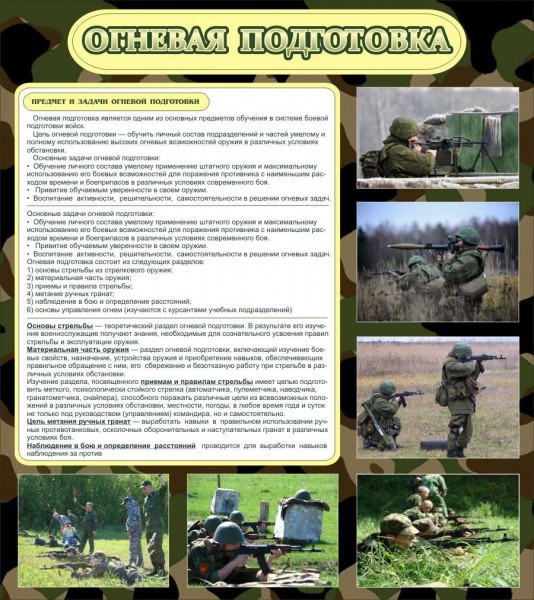 На стенде «Огневая подготовка» предоставлены ознакомительная информация о предмете и задачах огневой подготовки. Благодаря этому стенду ученики и курсанты военных заведений могут ознакомится с основами стрельбы, материальной частью оружия, целью метания гранат и всевозможной информации, относящийся к подготовке. Материал стенда - ПВХ, который позволяет его использовать при любых температурах. Помимо текста присутствуют цветные изображения в качестве примера. Стенд удобен тем, что его можно крепить на обычный двухсторонний скотч или другие способы, все зависит от стены.