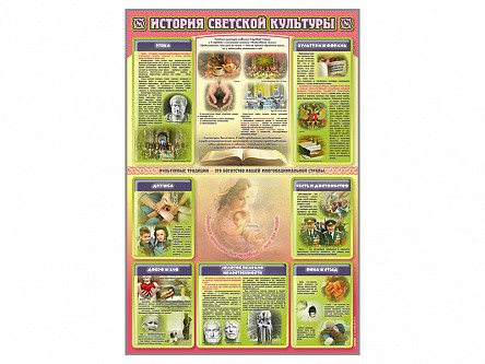 Стенд представляет собой панель, на которой размещена информация по предмету "основы религиозных культур и светской этики". Стенд предназначен для наглядного отображения информации об истории светской культуры.