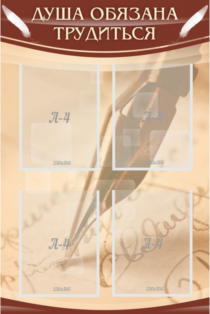 Руководство школы должно четко понимать свое участие в воспитании духовного состояния всех учеников своей школы, а также важность таких знаний в их будущей жизни. Стенд «Душа обязана трудится» сделан так, чтобы выделятся и привлекать внимание школьников, на основании которого равномерно расположено четыре прозрачных кармана А4 формата для разнообразных статей и примеров духовности великих поэтов, интересных высказываний, помогающих в будущей жизни детей. Для привлечения большего внимания дизайнеры «оставили» на стенде старинное перо тех веков, когда жили русские поэты.