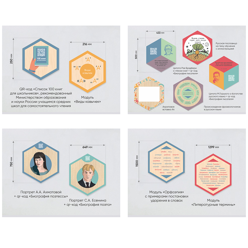 Каждый шестигранник содержит обучающую информацию: портреты выдающихся людей, их достижения и великие цитаты, основные постулаты науки, формулы, графики, теоремы. Благодаря qr-кодам дети могут подробнее узнать об учёных, изображённых на портретах, стоит только навести на них телефон.